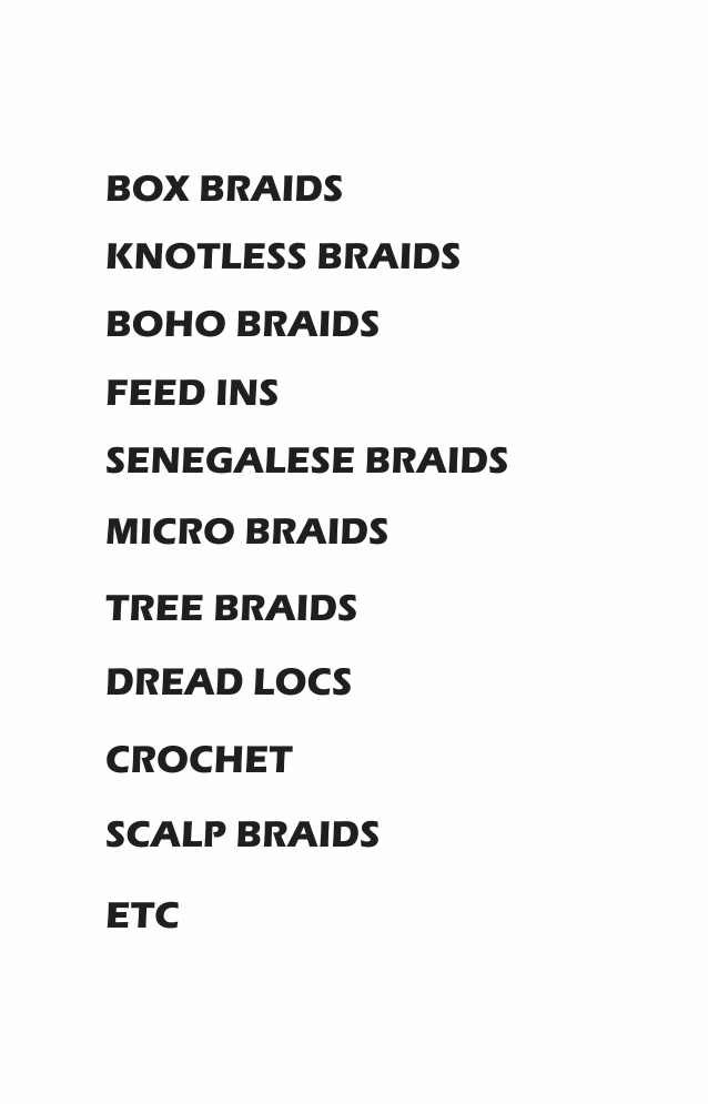 Every appointment is a chance to pamper you with exceptional service, high-quality products, and an atmosphere that feels like home. We celebrate all hair types and take pride in uplifting the beauty of natural hair through braiding styles that stand out and speak volumes.